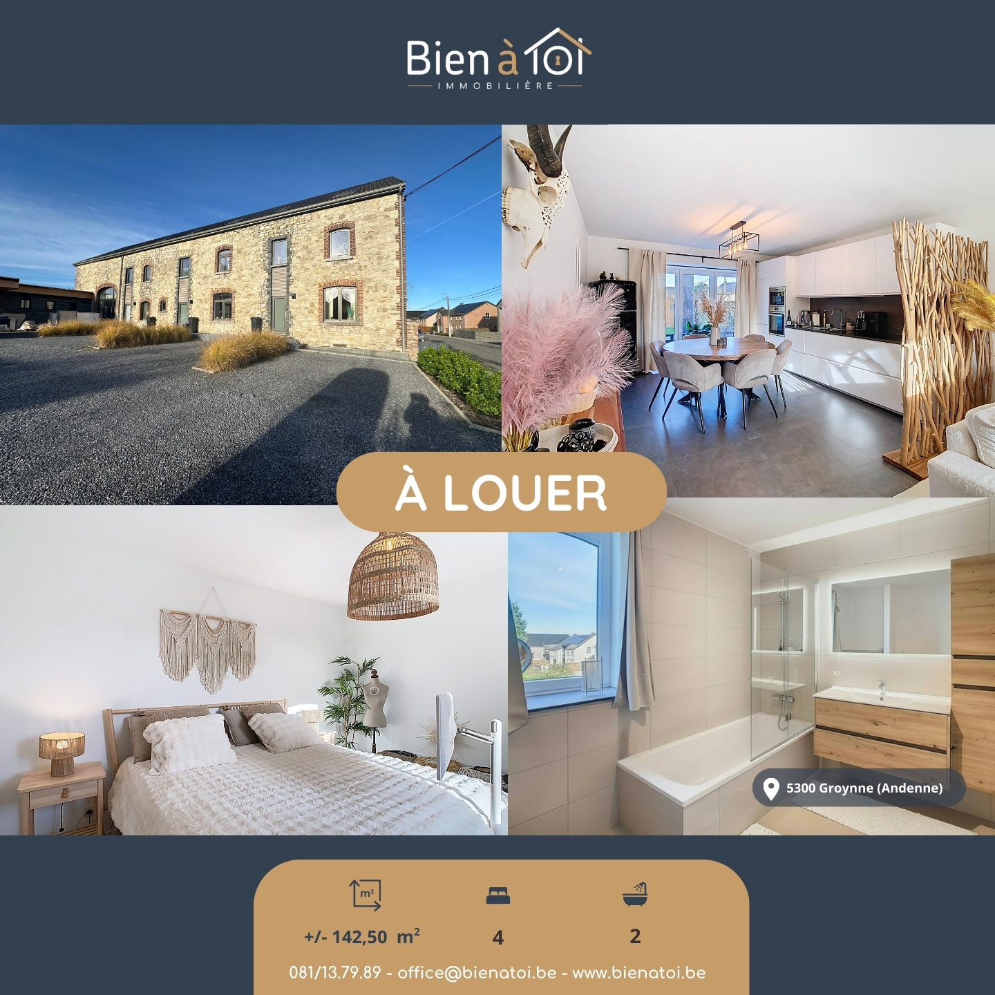 Bien à Toî vous propose une jolie maison entièrement rénovée de A à Z de 3 façades d'une superficie habitable de +/- 142,50 m². Excellente situation! Située au calme tout en étant proche des commodités, commerces, ... Excellent peb B! Elle comprend: rez: hall d'entrée avec placard et w.c séparé, lumineux séjour avec cuisine équipée américaine (frigo, four, four à micro-ondes, taque vitrocéramique, lave vaisselle) avec accès à la terrasse et au jardinet, buanderie; 1er étage: hall de nuit, 2 belles chambres, salle de bain; 2ème étage: hall de nuit, 2 grandes chambres, local technique/chaufferie avec une douche et lavabo; 3ème étage: grenier de rangement; sous-sol: cave. Provision de charges de 50 euros/mois: pour l'entretien de la chaudière, l'entretien et le changement des filtres de la VMC et l'assurance incendie abandon de recours contre le locataire. État des lieux à frais partagés entre le bailleur et le preneur. Autres: chauffage par le sol, chaudière au gaz à condensation avec production d'eau chaude, VMC simple flux, électricité bi-horaire, citerne eau de pluie, châssis en PVC DV, châlet de jardin, ... Libre à partir du 01 mars 2026. Renseignements et visites: 081/13.79.89 - office@bienatoi.be - www.bienatoi.be.